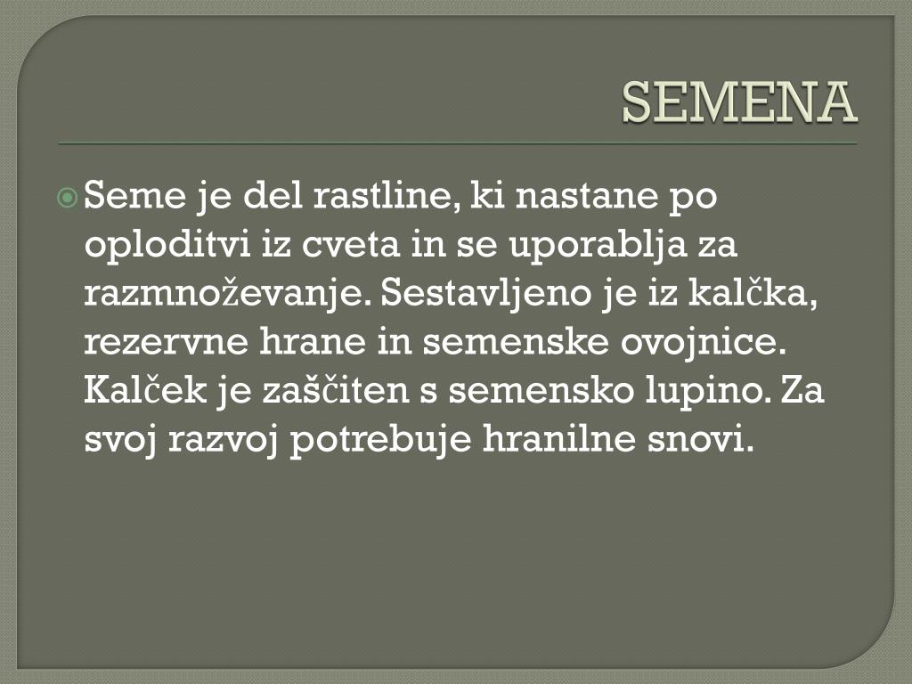 SEMENA Seme je del rastline, ki nastane po oploditvi iz cveta in se uporablja za razmnoževanje. Sestavljeno je iz kalčka, rezervne hrane in semenske ovojnice. Kalček je zaščiten s semensko lupino. Za svoj razvoj potrebuje hranilne snovi.