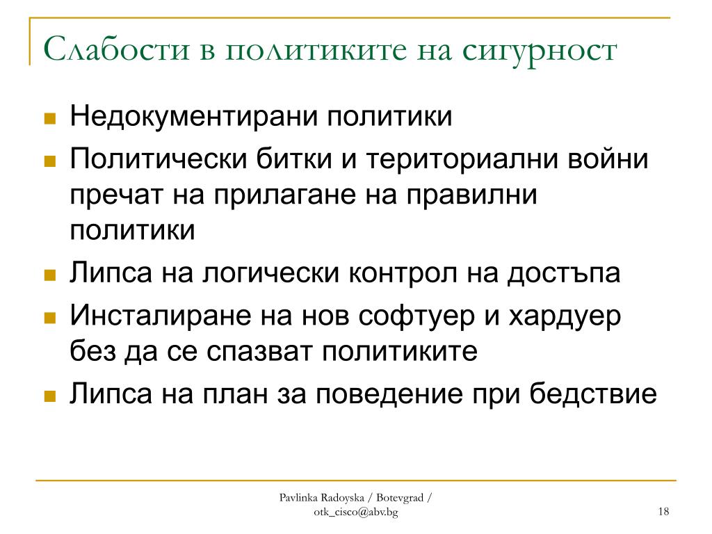 Слабости в политиките на сигурност • Недокументирани политики • Политически битки и териториални войни пречат на прилагане на правилни политики • Липса на логически контрол на достъпа • Инсталиране на нов софтуер и хардуер без да се спазват политиките • Липса на план за поведение при бедствие Pavlinka Radoyska / Botevgrad / otk_cisco@abv.bg