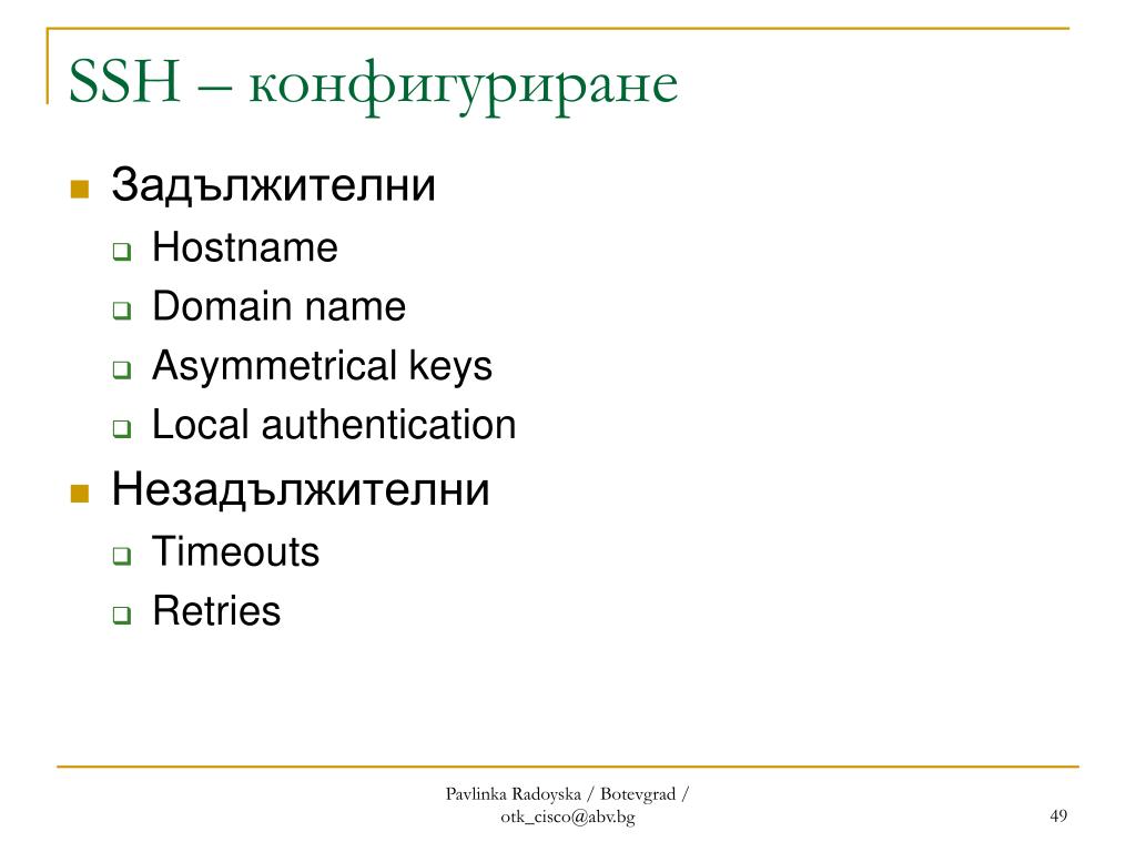 SSH – конфигуриране • Задължителни • Hostname • Domain name • Asymmetrical keys • Local authentication • Незадължителни • Timeouts • Retries Pavlinka Radoyska / Botevgrad / otk_cisco@abv.bg