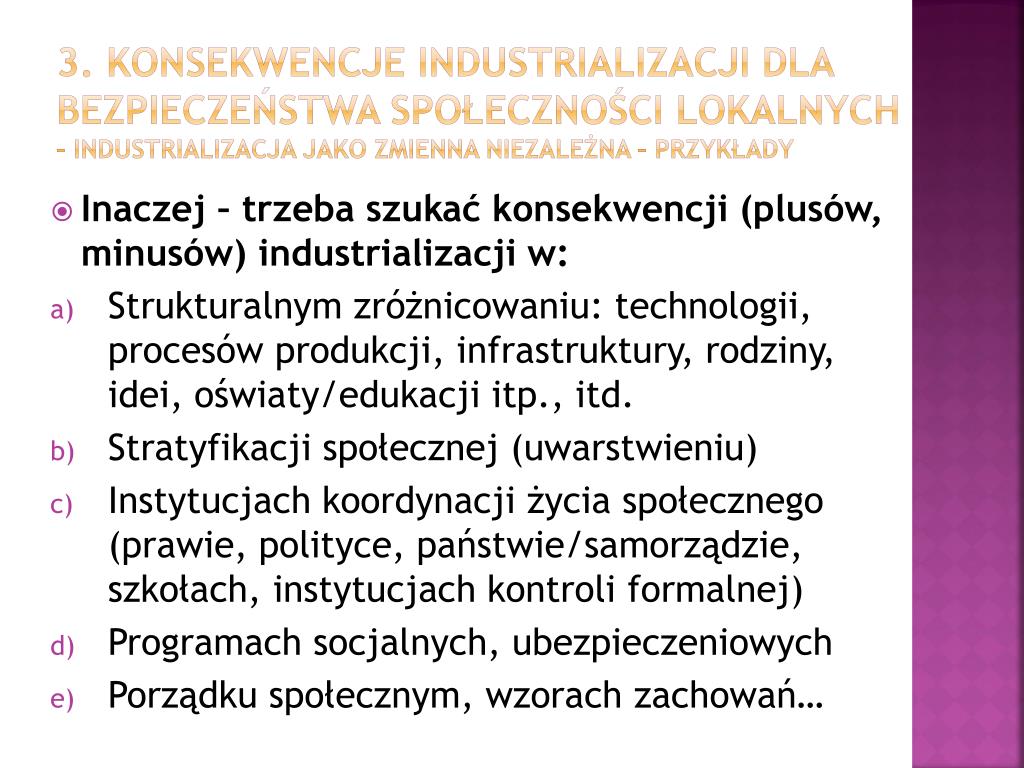 3. Konsekwencje industrializacji dla bezpieczeństwa społeczności lokalnych – industrializacja jako zmienna niezależna – przykłADy • Inaczej – trzeba szukać konsekwencji (plusów, minusów) industrializacji w: • Strukturalnym zróżnicowaniu: technologii, procesów produkcji, infrastruktury, rodziny, idei, oświaty/edukacji itp., itd. • Stratyfikacji społecznej (uwarstwieniu) • Instytucjach koordynacji życia społecznego (prawie, polityce, państwie/samorządzie, szkołach, instytucjach kontroli formalnej) • Programach socjalnych, ubezpieczeniowych • Porządku społecznym, wzorach zachowań…
