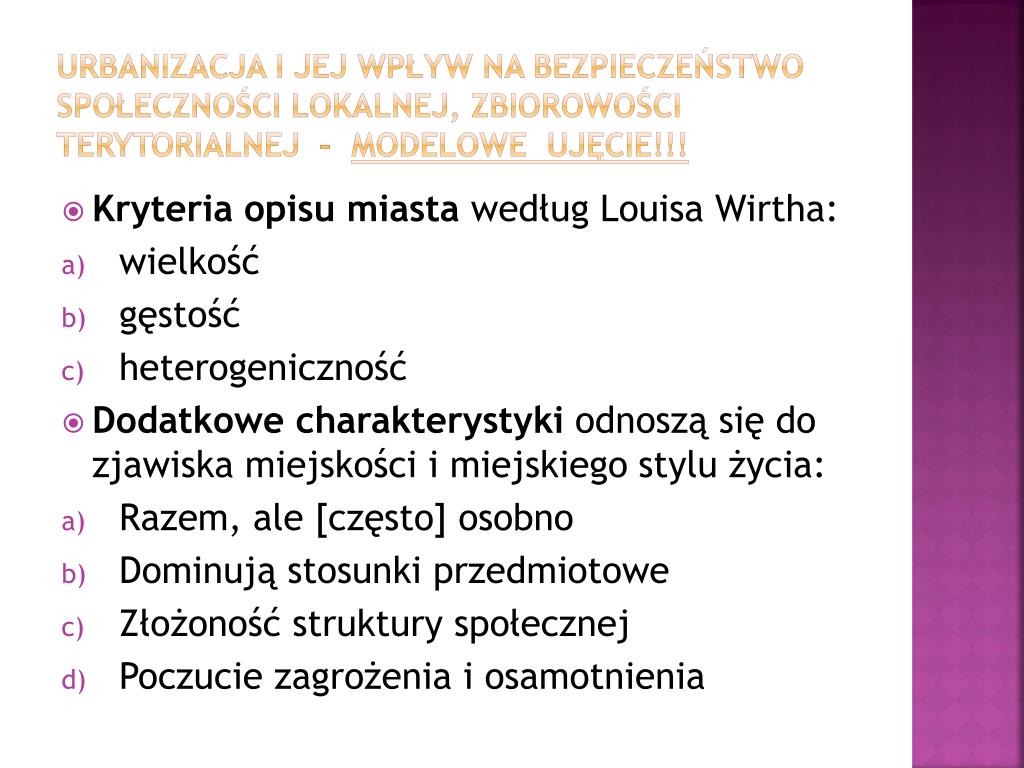 Urbanizacja i jej wpływ na bezpieczeństwo społeczności lokalnej, zbiorowości terytorialnej – modelowe ujęcie!!! • Kryteria opisu miasta według Louisa Wirtha: • wielkość • gęstość • heterogeniczność • Dodatkowe charakterystyki odnoszą się do zjawiska miejskości i miejskiego stylu życia: • Razem, ale [często] osobno • Dominują stosunki przedmiotowe • Złożoność struktury społecznej • Poczucie zagrożenia i osamotnienia