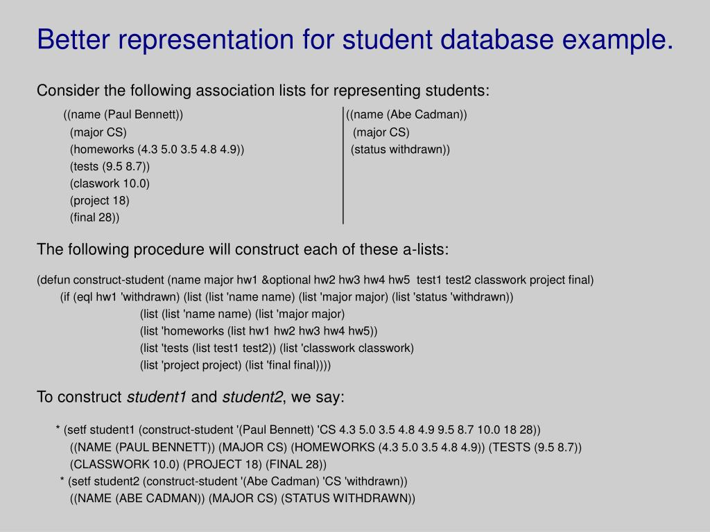 Better representation for student database example. Consider the following association lists for representing students: ((name (Paul Bennett)) ((name (Abe Cadman)) (major CS) (major CS) (homeworks (4.3 5.0 3.5 4.8 4.9)) (status withdrawn)) (tests (9.5 8.7)) (claswork 10.0) (project 18) (final 28)) The following procedure will construct each of these a-lists: (defun construct-student (name major hw1 &optional hw2 hw3 hw4 hw5 test1 test2 classwork project final) (if (eql hw1 'withdrawn) (list (list 'name name) (list 'major major) (list 'status 'withdrawn)) (list (list 'name name) (list 'major major) (list 'homeworks (list hw1 hw2 hw3 hw4 hw5)) (list 'tests (list test1 test2)) (list 'classwork classwork) (list 'project project) (list 'final final)))) To construct student1 and student2, we say: * (setf student1 (construct-student '(Paul Bennett) 'CS 4.3 5.0 3.5 4.8 4.9 9.5 8.7 10.0 18 28)) ((NAME (PAUL BENNETT)) (MAJOR CS) (HOMEWORKS (4.3 5.0 3.5 4.8 4.9)) (TESTS (9.5 8.7)) (CLASSWORK 10.0) (PROJECT 18) (FINAL 28)) * (setf student2 (construct-student '(Abe Cadman) 'CS 'withdrawn)) ((NAME (ABE CADMAN)) (MAJOR CS) (STATUS WITHDRAWN))