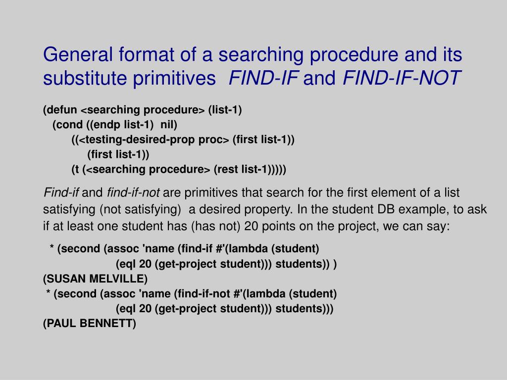 General format of a searchingprocedure and its substitute primitives FIND-IF and FIND-IF-NOT (defun <searching procedure> (list-1) (cond ((endp list-1) nil) ((<testing-desired-prop proc> (first list-1)) (first list-1)) (t (<searching procedure> (rest list-1))))) Find-if and find-if-not are primitives that search for the first element of a list satisfying (not satisfying) a desired property. In the student DB example, to ask if at least one student has (has not) 20 points on the project, we can say: * (second (assoc 'name (find-if #'(lambda (student) (eql 20 (get-project student))) students)) ) (SUSAN MELVILLE) * (second (assoc 'name (find-if-not #'(lambda (student) (eql 20 (get-project student))) students))) (PAUL BENNETT)