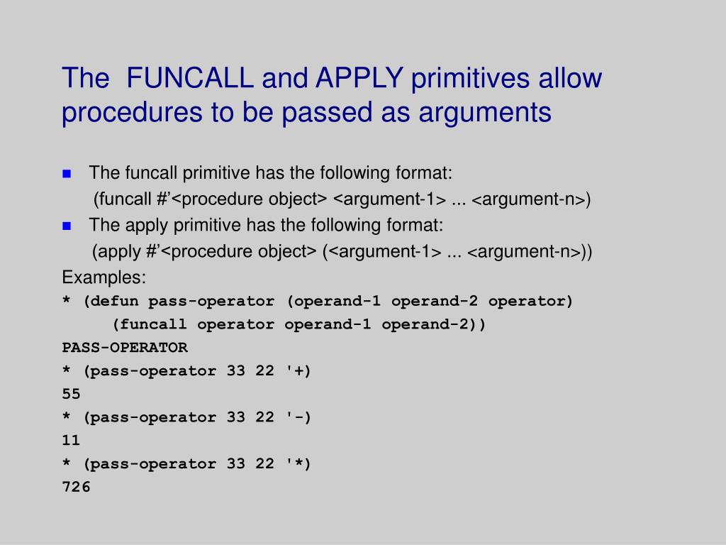 The FUNCALL and APPLY primitives allow procedures to be passed as arguments • The funcall primitive has the following format: (funcall #’<procedure object> <argument-1> ... <argument-n>) • The apply primitive has the following format: (apply #’<procedure object> (<argument-1> ... <argument-n>)) Examples: * (defun pass-operator (operand-1 operand-2 operator) (funcall operator operand-1 operand-2)) PASS-OPERATOR * (pass-operator 33 22 '+) 55 * (pass-operator 33 22 '-) 11 * (pass-operator 33 22 '*) 726