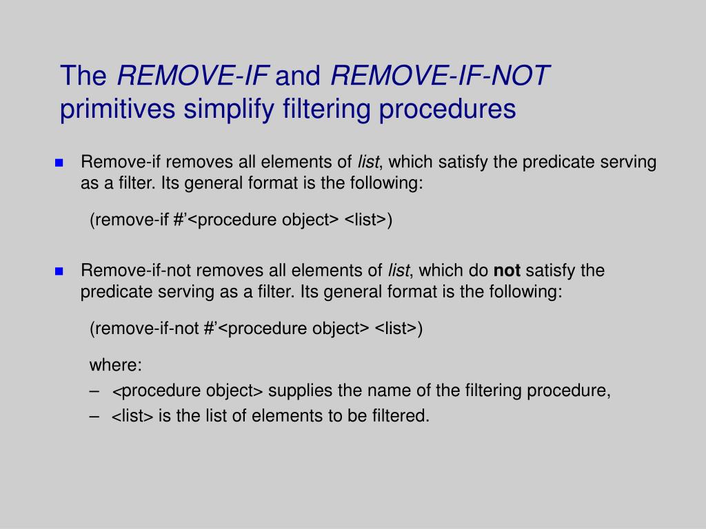 The REMOVE-IF and REMOVE-IF-NOT primitives simplify filtering procedures • Remove-if removes all elements of list, which satisfy the predicate serving as a filter. Its general format is the following: (remove-if #’<procedure object> <list>) • Remove-if-not removes all elements of list, which do not satisfy the predicate serving as a filter. Its general format is the following: (remove-if-not #’<procedure object> <list>) where: • <procedure object> supplies the name of the filtering procedure, • <list> is the list of elements to be filtered.