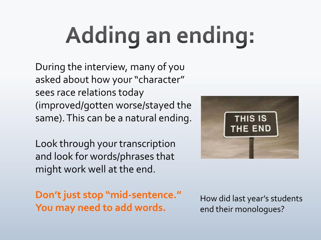 Adding an ending: During the interview, many of you asked about how your “character” sees race relations today (improved/gotten worse/stayed the same). This can be a natural ending. Look through your transcription and look for words/phrases that might work well at the end. Don’t just stop “mid-sentence.” You may need to add words. How did last year’s students end their monologues?