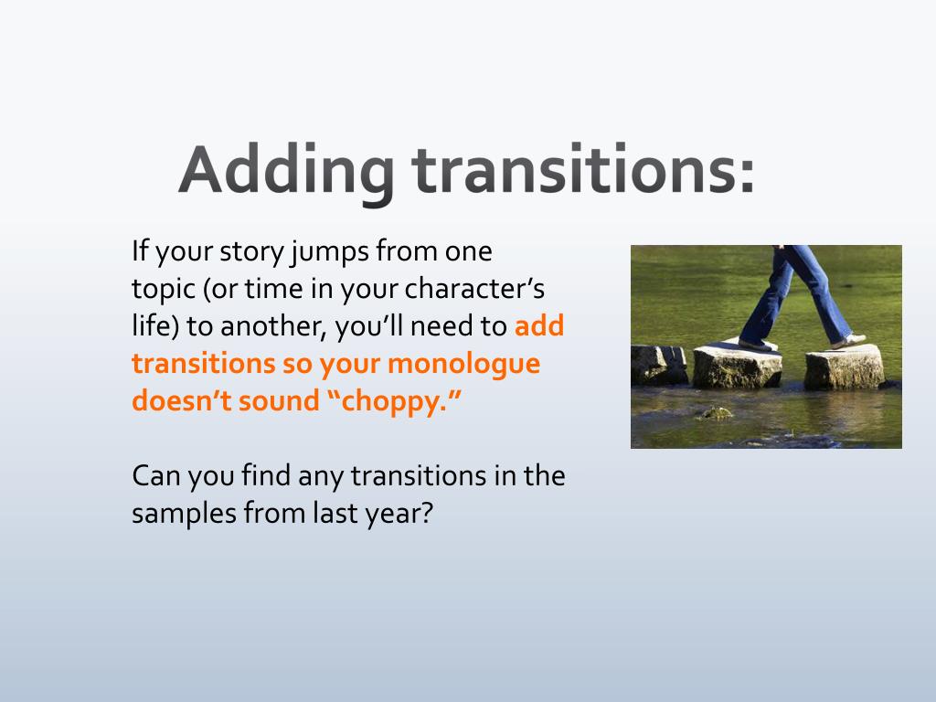 Adding transitions: If your story jumps from one topic (or time in your character’s life) to another, you’ll need to add transitions so your monologue doesn’t sound “choppy.” Can you find any transitions in the samples from last year?