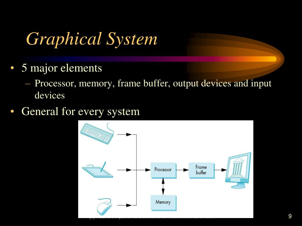 Graphical System • 5 major elements • Processor, memory, frame buffer, output devices and input devices • General for every system Applied Computer Science and Multimedia, SIE&T
