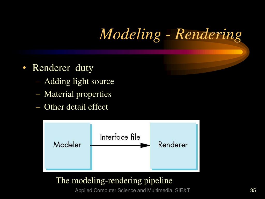 Modeling - Rendering • Renderer duty • Adding light source • Material properties • Other detail effect The modeling-rendering pipeline Applied Computer Science and Multimedia, SIE&T