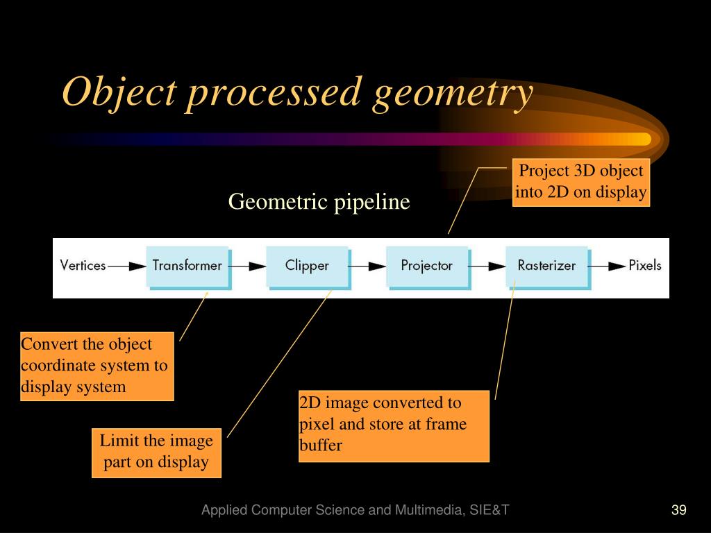 Object processed geometry Project 3D object into 2D on display Geometric pipeline Convert the object coordinate system to display system 2D image converted to pixel and store at frame buffer Limit the image part on display Applied Computer Science and Multimedia, SIE&T
