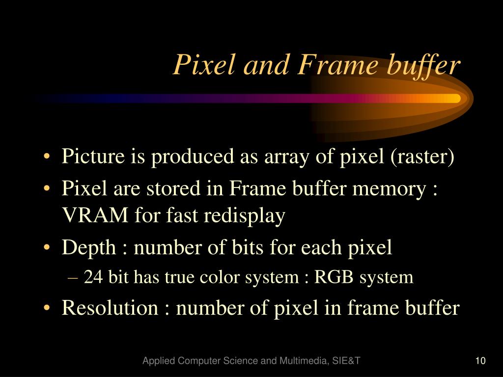 Pixel and Frame buffer • Picture is produced as array of pixel (raster) • Pixel are stored in Frame buffer memory : VRAM for fast redisplay • Depth : number of bits for each pixel • 24 bit has true color system : RGB system • Resolution : number of pixel in frame buffer Applied Computer Science and Multimedia, SIE&T