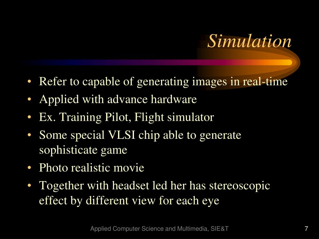 Simulation • Refer to capable of generating images in real-time • Applied with advance hardware • Ex. Training Pilot, Flight simulator • Some special VLSI chip able to generate sophisticate game • Photo realistic movie • Together with headset led her has stereoscopic effect by different view for each eye Applied Computer Science and Multimedia, SIE&T