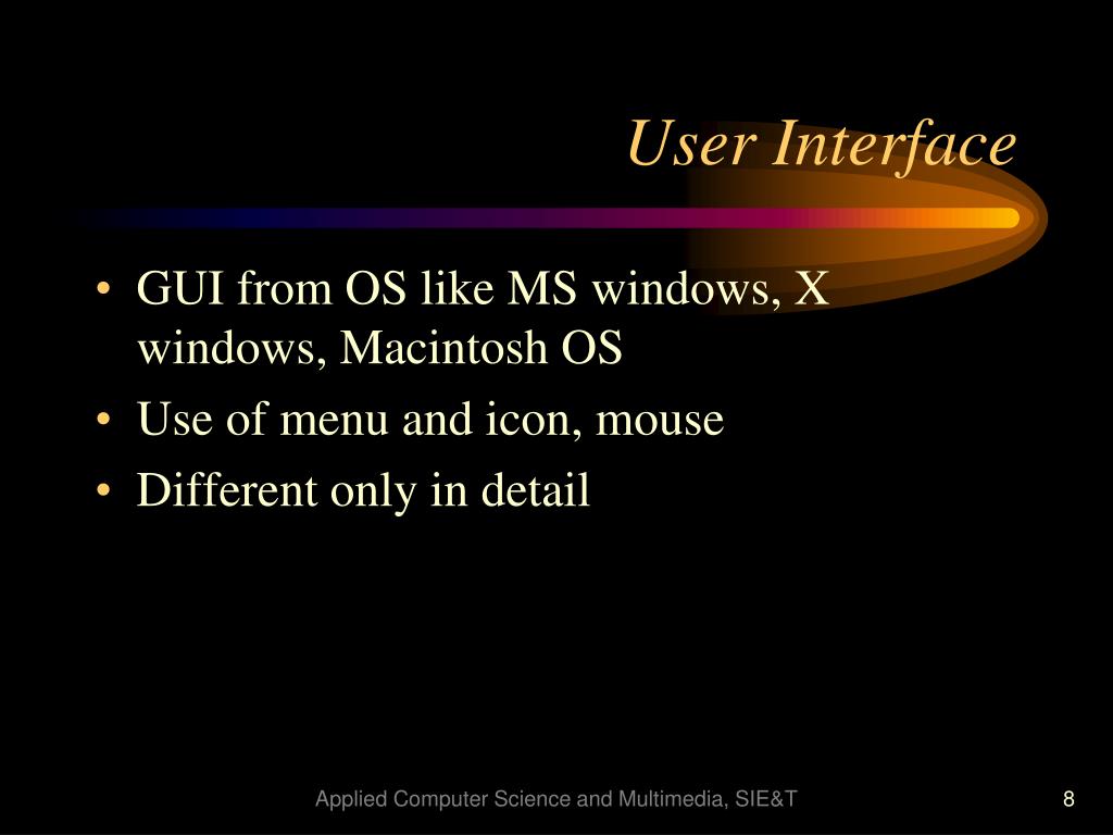 User Interface • GUI from OS like MS windows, X windows, Macintosh OS • Use of menu and icon, mouse • Different only in detail Applied Computer Science and Multimedia, SIE&T