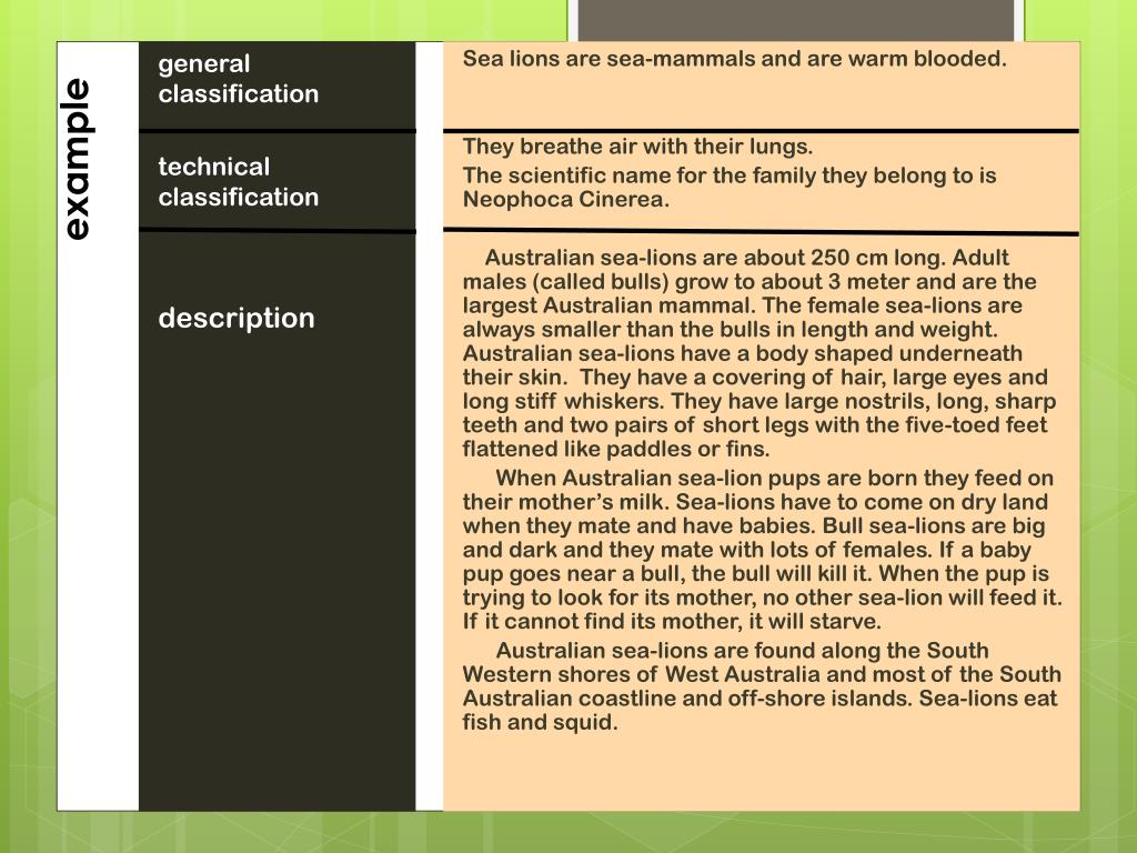 example general classification technical classification description Sea lions are sea-mammals and are warm blooded. They breathe air with their lungs. The scientific name for the family they belong to is NeophocaCinerea. Australian sea-lions are about 250 cm long. Adult males (called bulls) grow to about 3 meter and are the largest Australian mammal. The female sea-lions are always smaller than the bulls in length and weight. Australian sea-lions have a body shaped underneath their skin. They have a covering of hair, large eyes and long stiff whiskers. They have large nostrils, long, sharp teeth and two pairs of short legs with the five-toed feet flattened like paddles or fins. When Australian sea-lion pups are born they feed on their mother’s milk. Sea-lions have to come on dry land when they mate and have babies. Bull sea-lions are big and dark and they mate with lots of females. If a baby pup goes near a bull, the bull will kill it. When the pup is trying to look for its mother, no other sea-lion will feed it. If it cannot find its mother, it will starve. Australian sea-lions are found along the South Western shores of West Australia and most of the South Australian coastline and off-shore islands. Sea-lions eat fish and squid.