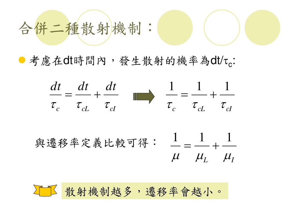 合併二種散射機制: • 考慮在dt時間內,發生散射的機率為dt/c: 與遷移率定義比較可得: 散射機制越多,遷移率會越小。