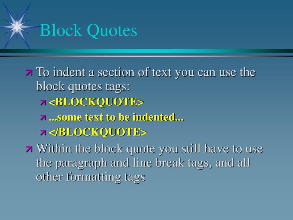 Block Quotes • To indent a section of text you can use the block quotes tags: • <BLOCKQUOTE> • ...some text to be indented... • </BLOCKQUOTE> • Within the block quote you still have to use the paragraph and line break tags, and all other formatting tags