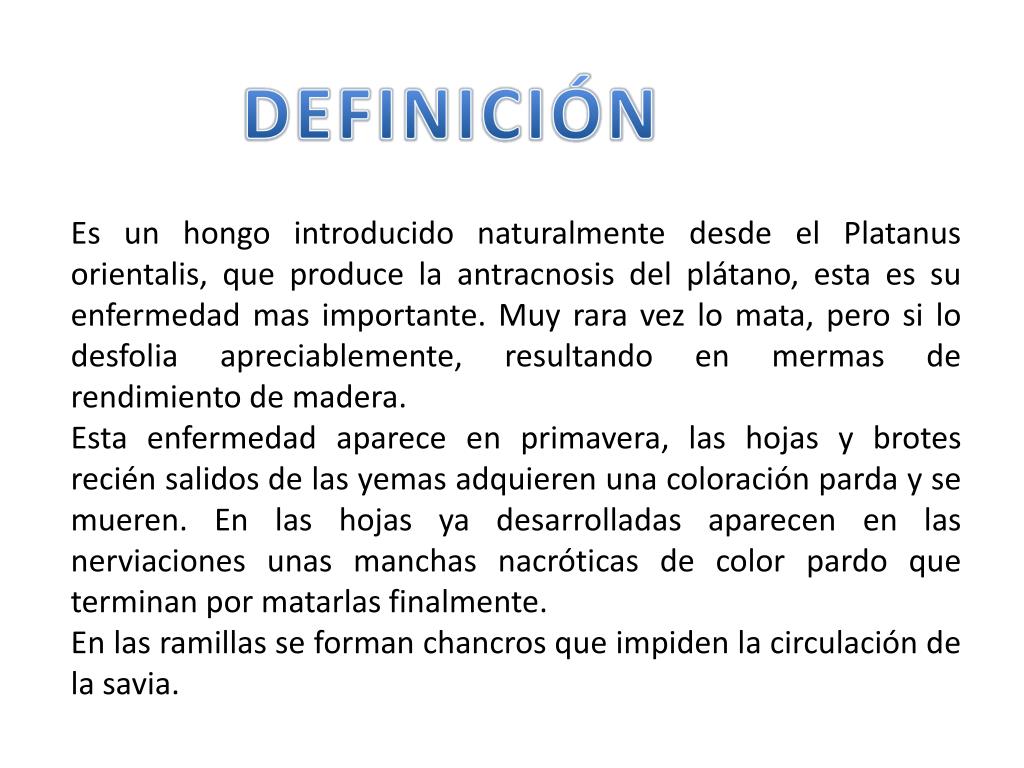 DEFINICIÓN Es un hongo introducido naturalmente desde el Platanus orientalis, que produce la antracnosis del plátano, esta es su enfermedad mas importante. Muy rara vez lo mata, pero si lo desfolia apreciablemente, resultando en mermas de rendimiento de madera. Esta enfermedad aparece en primavera, las hojas y brotes recién salidos de las yemas adquieren una coloración parda y se mueren. En las hojas ya desarrolladas aparecen en las nerviaciones unas manchas nacróticas de color pardo que terminan por matarlas finalmente. En las ramillas se forman chancros que impiden la circulación de la savia.