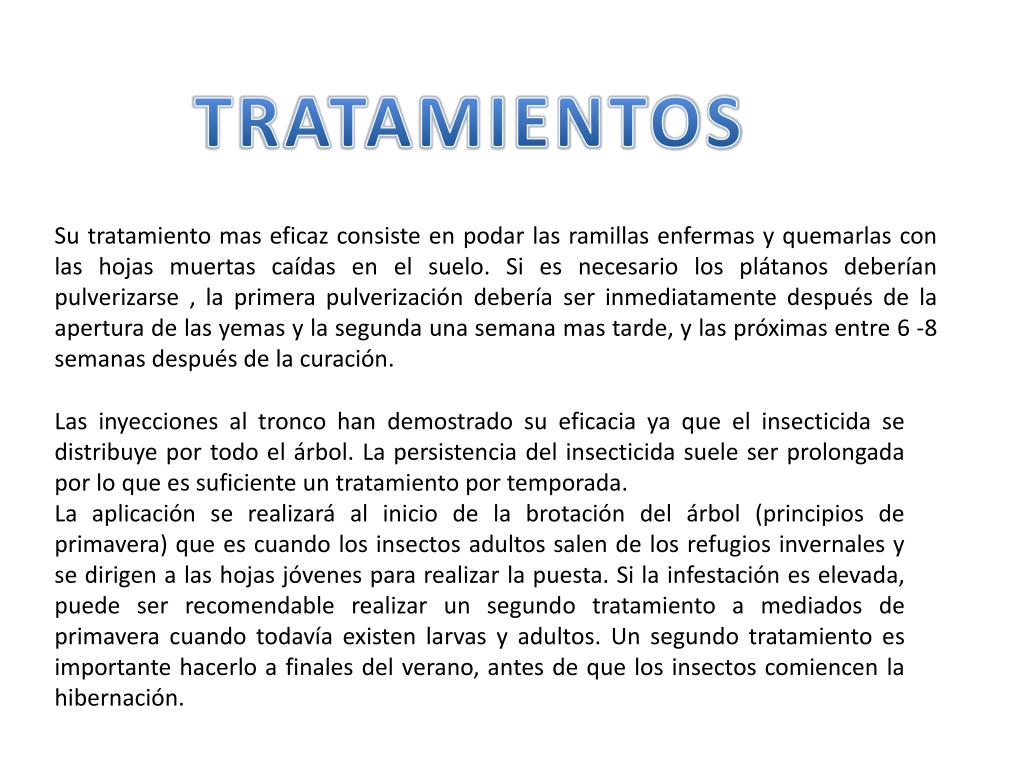 TRATAMIENTOS Su tratamiento mas eficaz consiste en podar las ramillas enfermas y quemarlas con las hojas muertas caídas en el suelo. Si es necesario los plátanos deberían pulverizarse , la primera pulverización debería ser inmediatamente después de la apertura de las yemas y la segunda una semana mas tarde, y las próximas entre 6 -8 semanas después de la curación. Las inyecciones al tronco han demostrado su eficacia ya que el insecticida se distribuye por todo el árbol. La persistencia del insecticida suele ser prolongada por lo que es suficiente un tratamiento por temporada. La aplicación se realizará al inicio de la brotación del árbol (principios de primavera) que es cuando los insectos adultos salen de los refugios invernales y se dirigen a las hojas jóvenes para realizar la puesta. Si la infestación es elevada, puede ser recomendable realizar un segundo tratamiento a mediados de primavera cuando todavía existen larvas y adultos. Un segundo tratamiento es importante hacerlo a finales del verano, antes de que los insectos comiencen la hibernación.