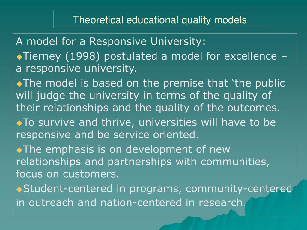 A model for a Responsive University: • Tierney (1998) postulated a model for excellence – a responsive university. • The model is based on the premise that ‘the public will judge the university in terms of the quality of their relationships and the quality of the outcomes. • To survive and thrive, universities will have to be responsive and be service oriented. • The emphasis is on development of new relationships and partnerships with communities, focus on customers. • Student-centered in programs, community-centered in outreach and nation-centered in research. Theoretical educational quality models