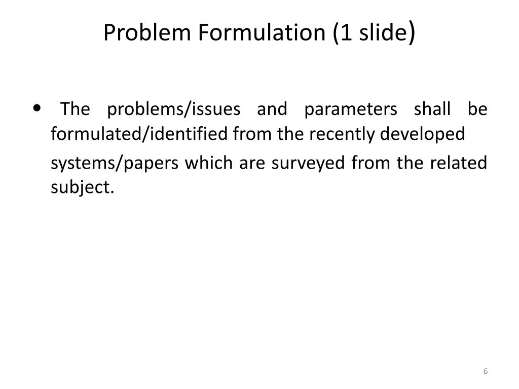 Problem Formulation (1 slide) • The problems/issues and parameters shall be formulated/identified from the recently developed systems/papers which are surveyed from the related subject.