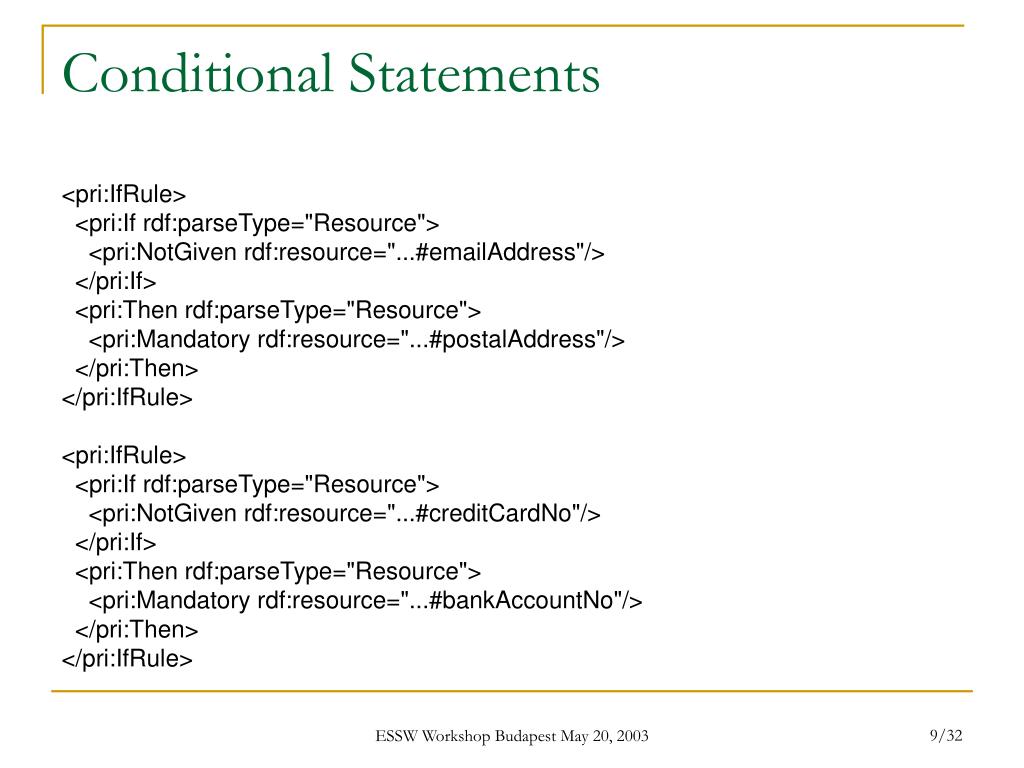 Conditional Statements <pri:IfRule> <pri:If rdf:parseType="Resource"> <pri:NotGiven rdf:resource="...#emailAddress"/> </pri:If> <pri:Then rdf:parseType="Resource"> <pri:Mandatory rdf:resource="...#postalAddress"/> </pri:Then> </pri:IfRule> <pri:IfRule> <pri:If rdf:parseType="Resource"> <pri:NotGiven rdf:resource="...#creditCardNo"/> </pri:If> <pri:Then rdf:parseType="Resource"> <pri:Mandatory rdf:resource="...#bankAccountNo"/> </pri:Then> </pri:IfRule> ESSW Workshop Budapest May 20, 2003