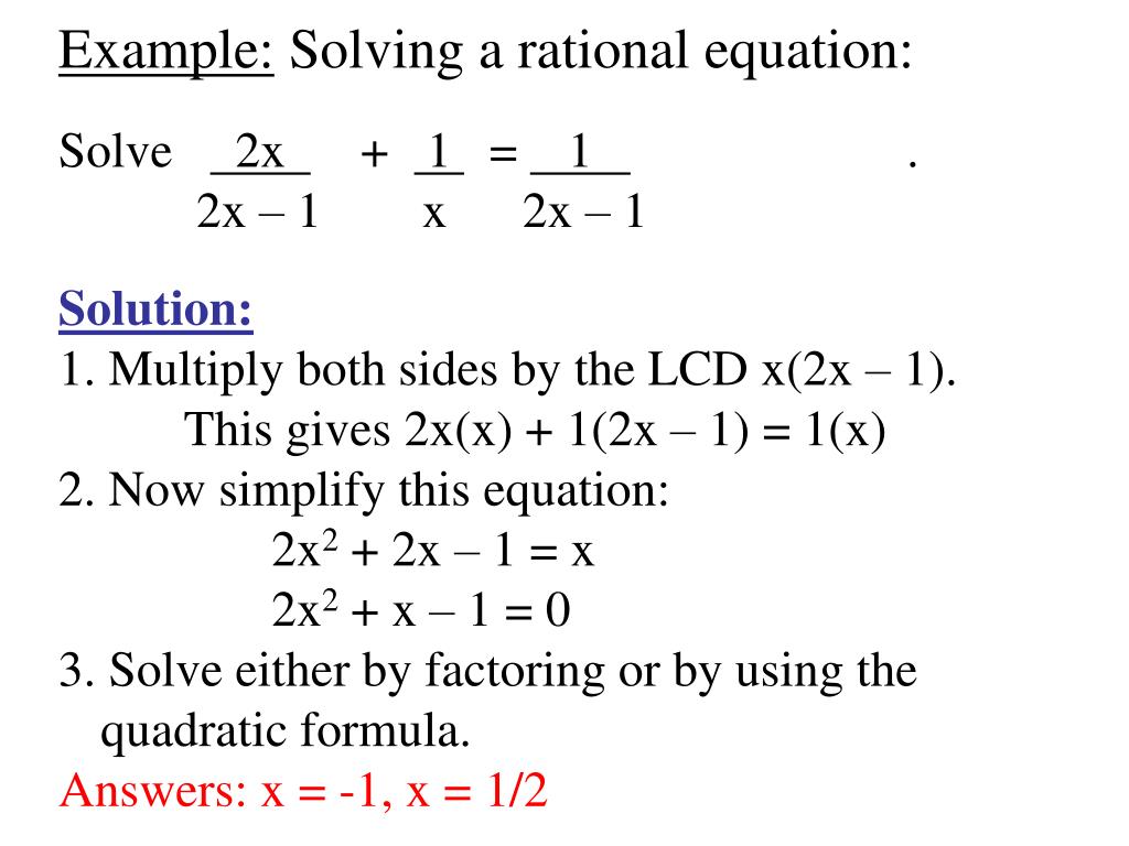Example: Solving a rational equation: Solve 2x + 1 = 1 . 2x – 1 x 2x – 1 Solution: 1. Multiply both sides by the LCD x(2x – 1). This gives 2x(x) + 1(2x – 1) = 1(x) 2. Now simplify this equation: 2x2 + 2x – 1 = x 2x2 + x – 1 = 0 3. Solve either by factoring or by using the quadratic formula. Answers: x = -1, x = 1/2