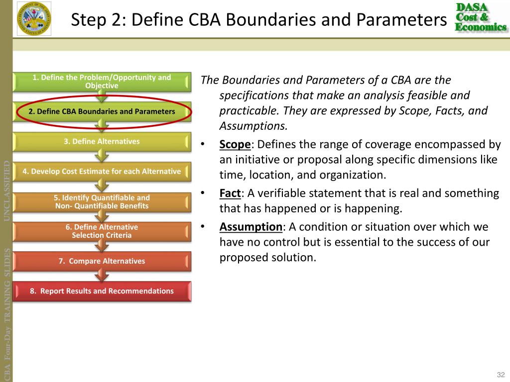 Step 2: Define CBA Boundaries and Parameters The Boundaries and Parameters of a CBA are the specifications that make an analysis feasible and practicable. They are expressed by Scope, Facts, and Assumptions. • Scope: Defines the range of coverage encompassed by an initiative or proposal along specific dimensions like time, location, and organization. • Fact: A verifiable statement that is real and something that has happened or is happening. • Assumption: A condition or situation over which we have no control but is essential to the success of our proposed solution.