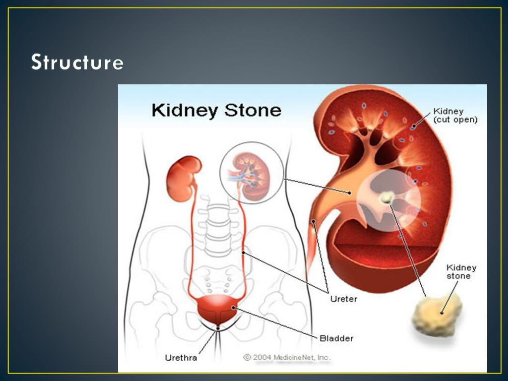 What is a Kidney Stone? • Kidney stones are small, hard deposits that form inside your kidney. They are made of minerals and acid salts. Kidney stones form when the urine becomes concentrated, allowing minerals to crystallize and stick together. • Passing kidney stones can be painful. The pain starts from your back side (below your ribs),and moves to your lower abdomen.