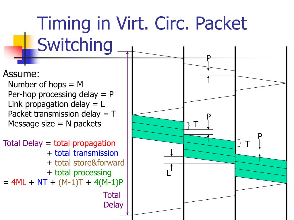 Timing in Datagram Packet Switching Assume: Number of hops = M Per-hop processing delay = P Link propagation delay = L Packet transmission delay = T Message size = N packets Total Delay = total propagation + total transmission +total store&forward + total processing = ML + NT + (M-1)T + (M-1)P P T P T Total Delay L