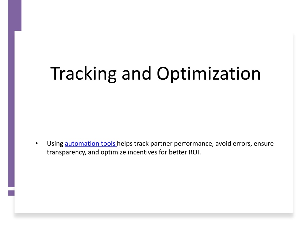 Tracking and Optimization • Using automation tools helps track partner performance, avoid errors, ensure transparency, and optimize incentives for better ROI.