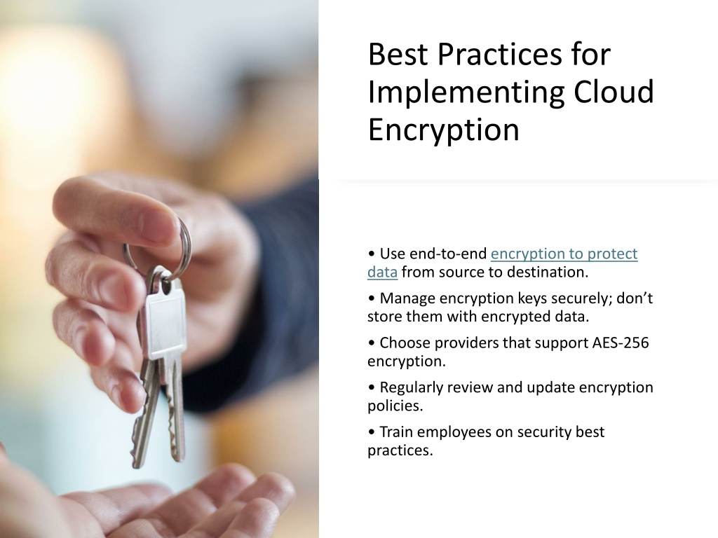 5. Best Practices for Implementing Cloud Encryption • Use end-to-end encryption to protect data from source to destination. • Manage encryption keys securely; don’t store them with encrypted data. • Choose providers that support AES-256 encryption. • Regularly review and update encryption policies. • Train employees on security best practices.
