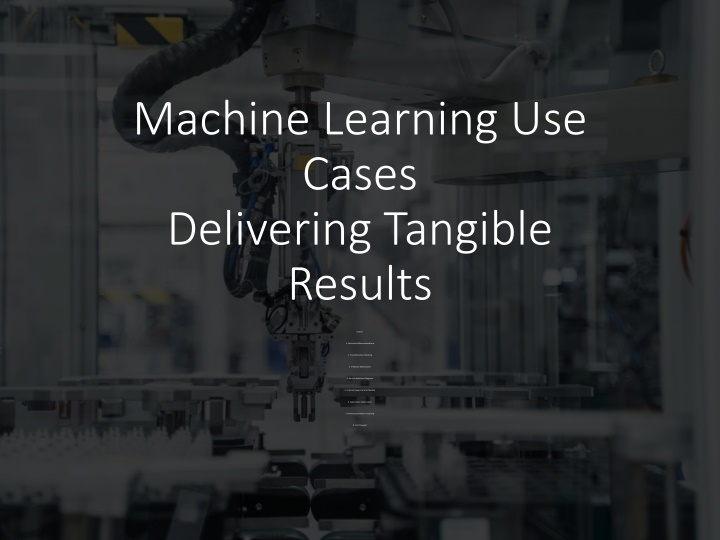Machine Learning Use Cases Delivering Tangible Results Outline: 1. Personalized Recommendations 2. Fraud Detection in Banking 3. Predictive Maintenance 4. Smarter Healthcare Diagnosis 5. Customer Support with AI Chatbots 6. Supply Chain Optimization 7. Marketing and Sales Forecasting 8. Final Thoughts