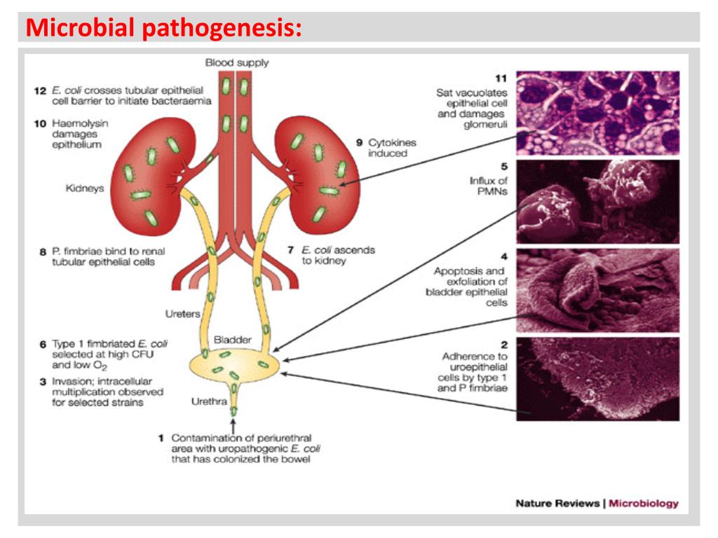 Microbial Pathogenesis : Pyelonephritis is established according to the following arranged Consequences: 1-The bacterial lower urinary tract infection. 2-PMNs influx from lower urinary bladderto ureter and kidney. 3-Reflux of infected urine up the ureters into the renal pelvis due to: A-Congenital abnormality ( short intravesical ureter). B- Obstruction of ureters ( ureter stone or carcinoma). If PMN cell proliferation occurs in Renal Pelvis;Pyelonephritis will be established.