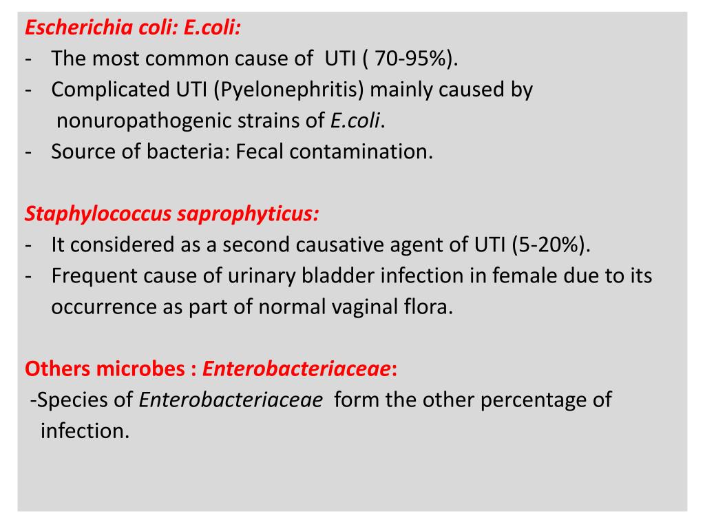 a Escherichia coli: E.coli: The most common cause of UTI ( 70-95%). Complicated UTI (Pyelonephritis) mainly caused by nonuropathogenic strains of E.coli. Source of bacteria: Fecal contamination. Staphylococcus saprophyticus: It considered as a second causative agent of UTI (5-20%). Frequent cause of urinary bladder infection in female due to its occurrence as part of normal vaginal flora. Others microbes : Enterobacteriaceae: -Species of Enterobacteriaceae form the other percentage of infection.