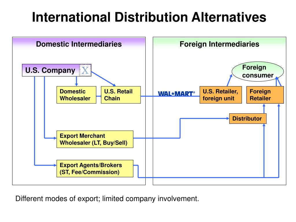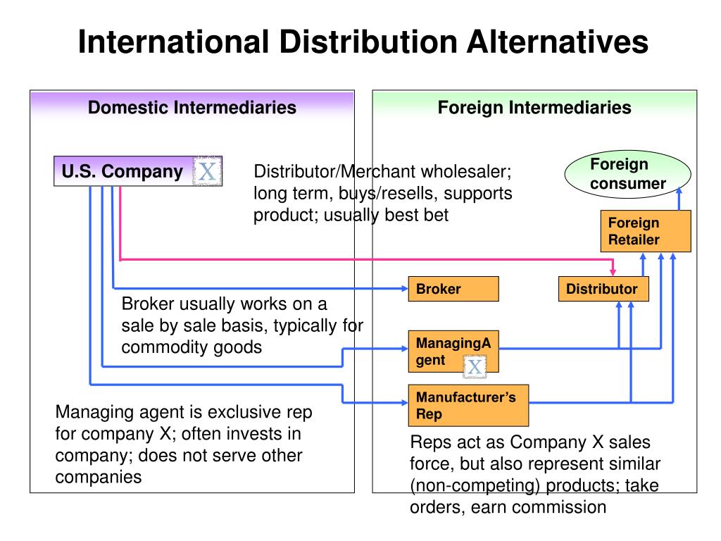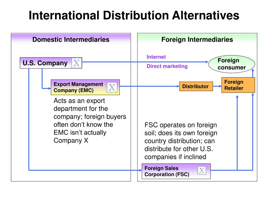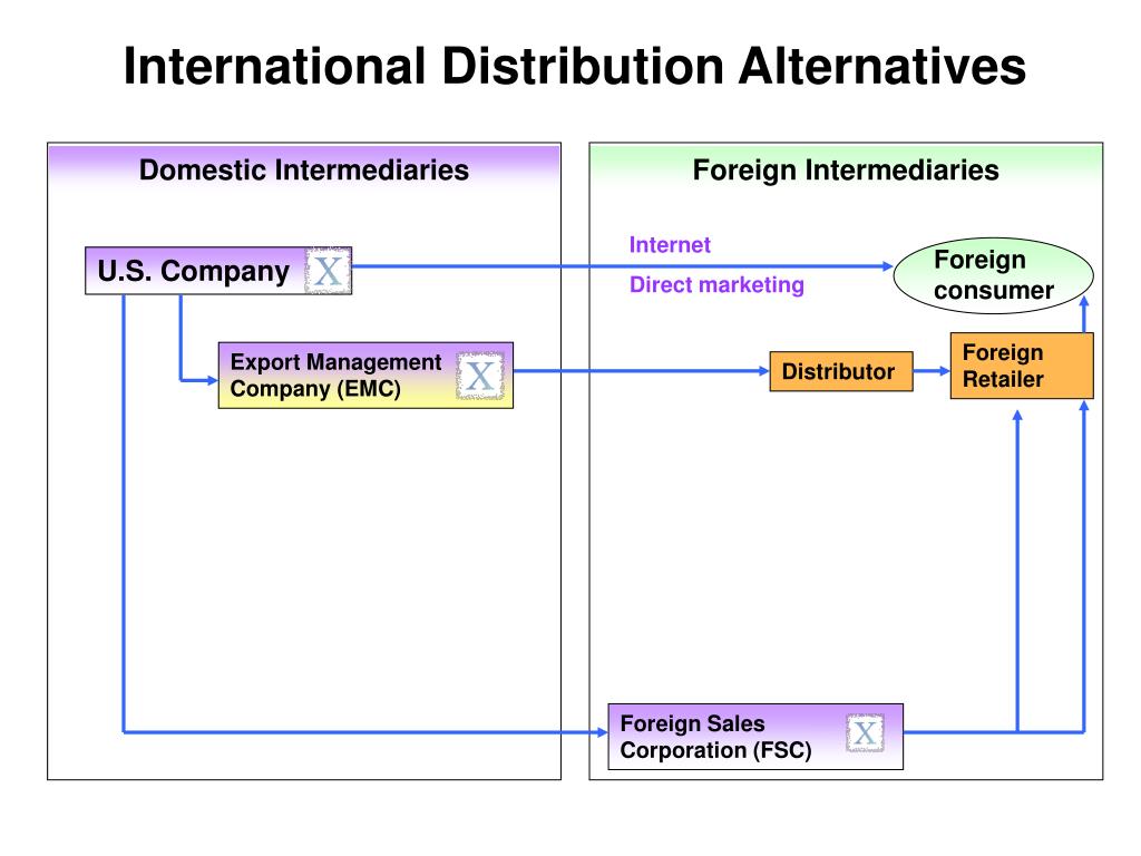 International Distribution Alternatives. Domestic Intermediaries. Foreign Intermediaries. Internet Direct marketing. Foreign consumer. U.S. Company. Domestic Wholesaler. U.S. Retail Chain. U.S. Retailer, foreign unit. Foreign Retailer. Export Management Company (EMC). Distributor.