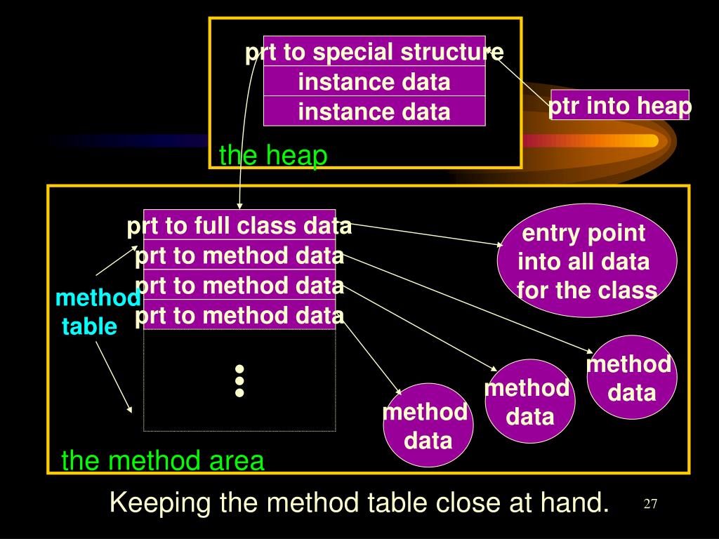 prt to special structure instance data ptr into heap instance data the heap entry point into all data for the class prt to full class data prt to method data prt to method data method table prt to method data ● ● ● method data method data method data the method area Keeping the method table close at hand.