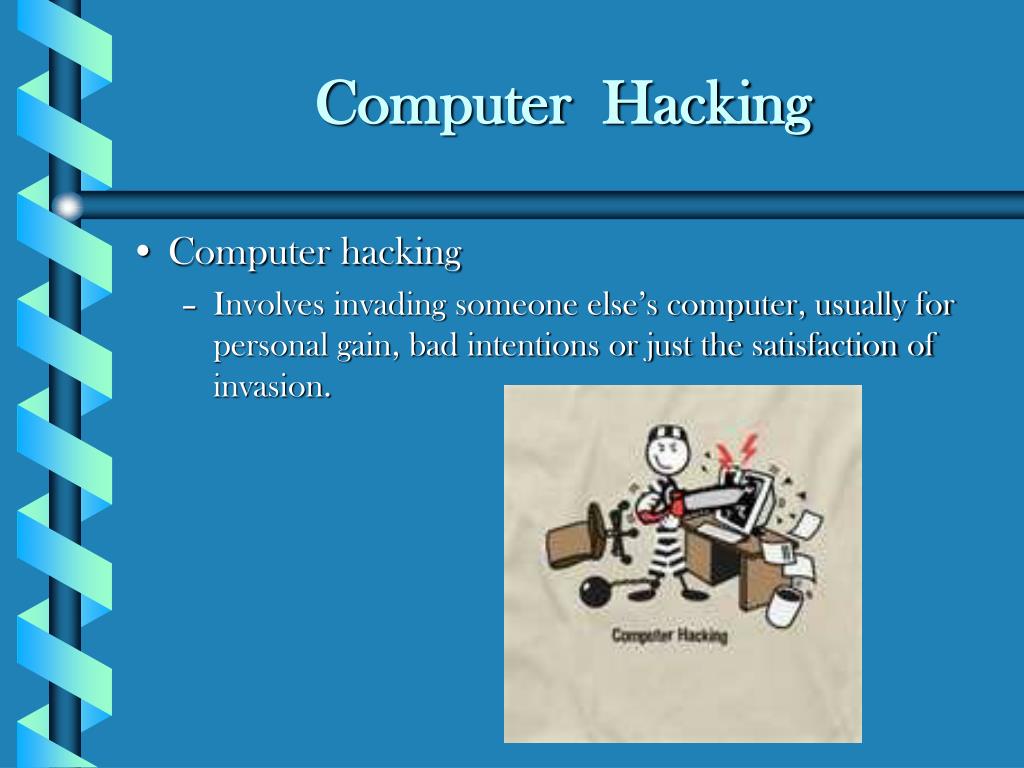 Computer Hacking • Computer hacking • Involves invading someone else’s computer, usually for personal gain, bad intentions or just the satisfaction of invasion.