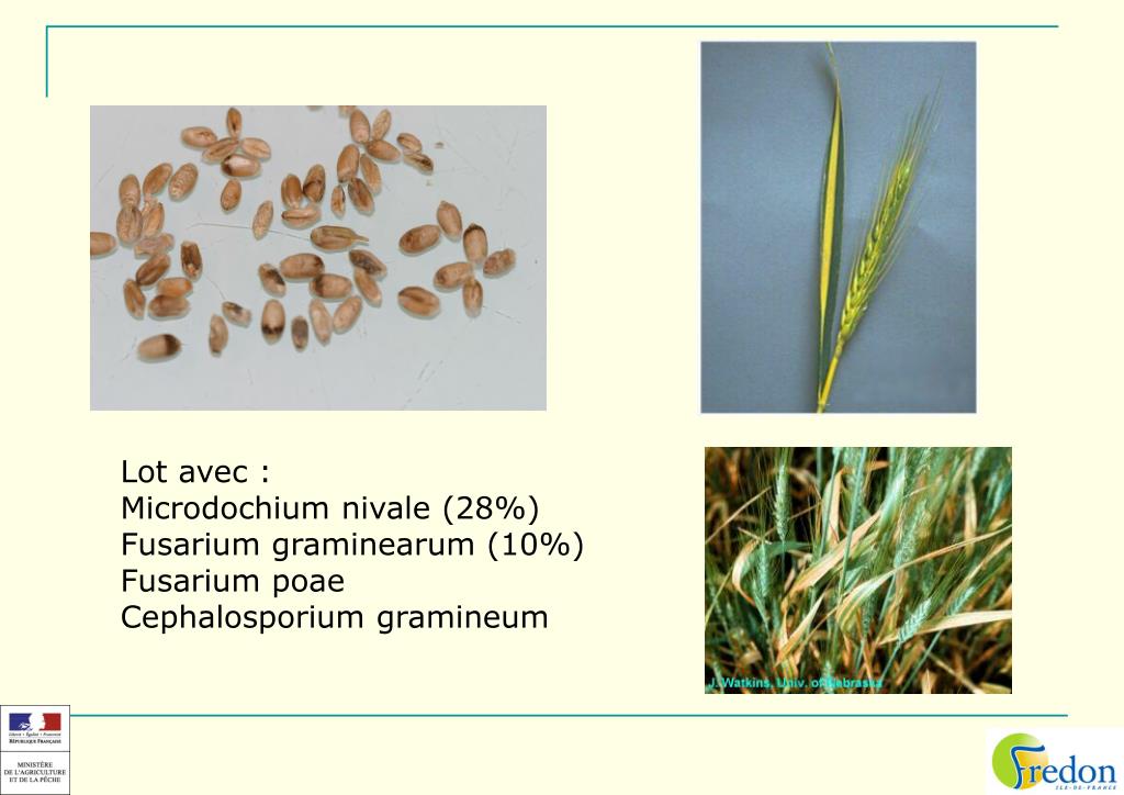 Lot avec : Microdochium nivale (28%) Fusarium graminearum (10%) Fusarium poae Cephalosporium gramineum