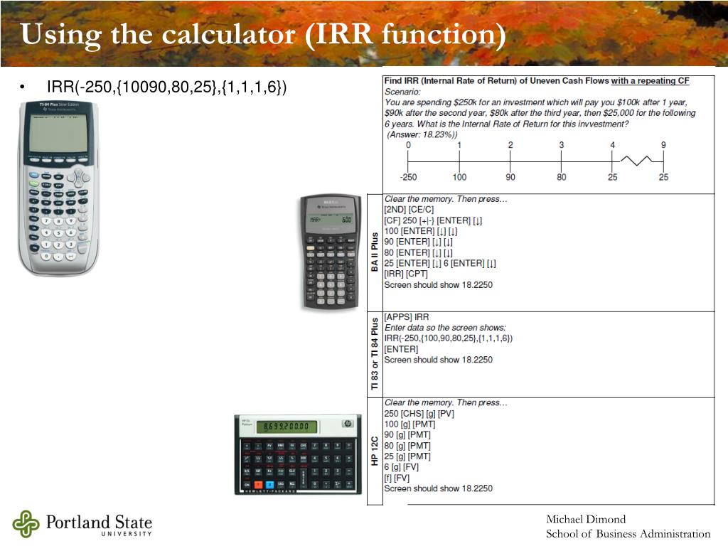 Using the calculator (IRR function) • IRR(-250,{10090,80,25},{1,1,1,6})