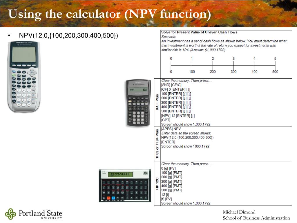 Using the calculator (NPV function) • NPV(12,0,{100,200,300,400,500})