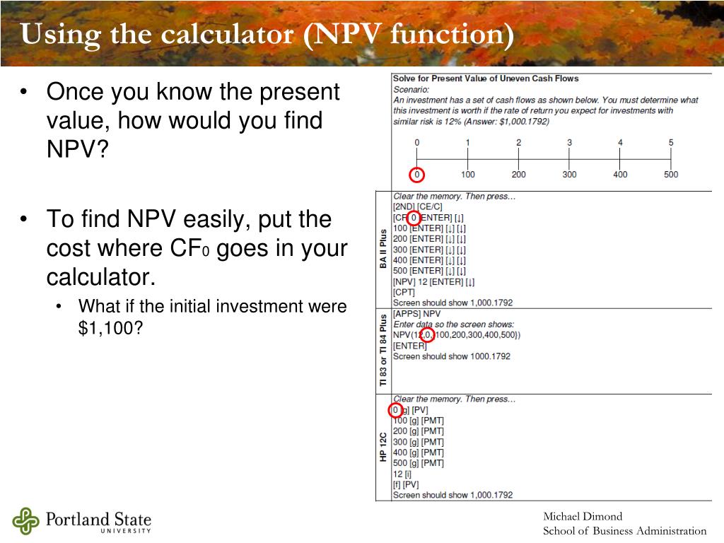 Using the calculator (NPV function) • Once you know the present value, how would you find NPV? • To find NPV easily, put the cost where CF0 goes in your calculator. • What if the initial investment were $1,100?