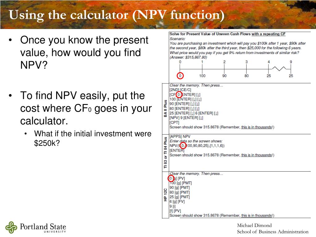 Using the calculator (NPV function) • Once you know the present value, how would you find NPV? • To find NPV easily, put the cost where CF0 goes in your calculator. • What if the initial investment were $250k?
