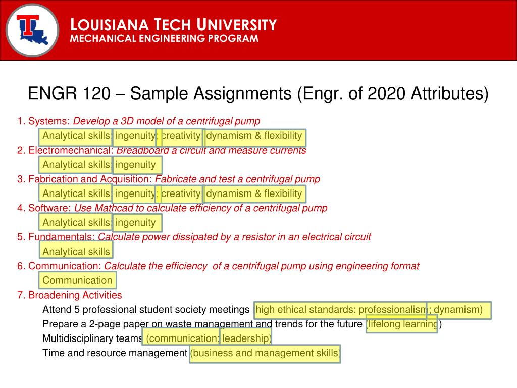 ENGR 120 – Sample Assignments (Engr. of 2020 Attributes) 1. Systems: Develop a 3D model of a centrifugal pump Analytical skills; ingenuity; creativity; dynamism & flexibility 2. Electromechanical: Breadboard a circuit and measure currents Analytical skills; ingenuity 3. Fabrication and Acquisition: Fabricate and test a centrifugal pump Analytical skills; ingenuity; creativity; dynamism & flexibility 4. Software: Use Mathcad to calculate efficiency of a centrifugal pump Analytical skills; ingenuity 5. Fundamentals: Calculate power dissipated by a resistor in an electrical circuit Analytical skills 6. Communication: Calculate the efficiency of a centrifugal pump using engineering format Communication 7. Broadening Activities Attend 5 professional student society meetings (high ethical standards; professionalism; dynamism) Prepare a 2-page paper on waste management and trends for the future (lifelong learning) Multidisciplinary teams (communication; leadership) Time and resource management (business and management skills)