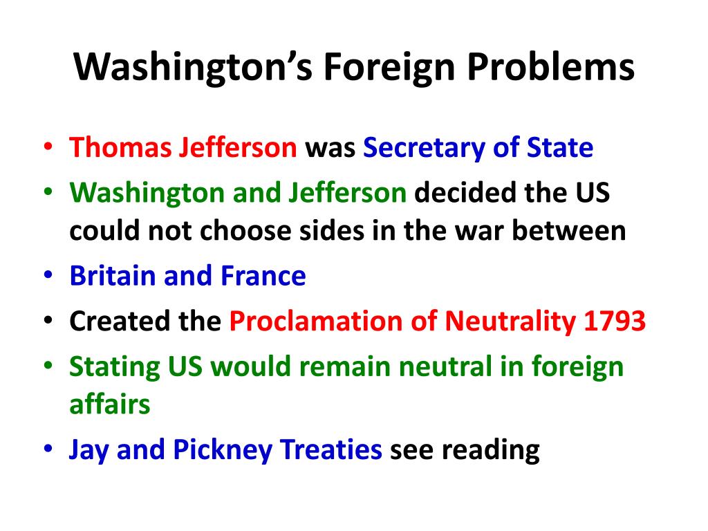 George Washington 1789-1797. Washington’s Foreign Problems. Thomas Jefferson was Secretary of State Washington and Jefferson decided the US could not choose sides in the war between Britain and France Created the Proclamation of Neutrality 1793