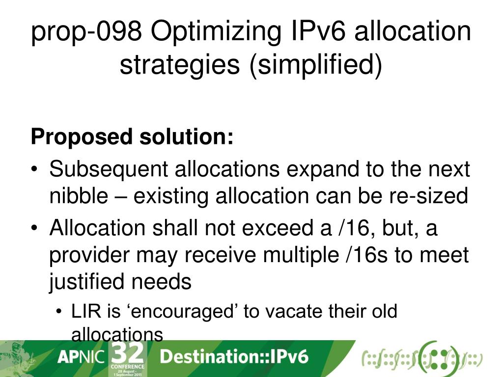 prop-098 Optimizing IPv6 allocation strategies (simplified) Proposed solution: • Allow LIRs to request nibble-aligned blocks of any size greater than or equal to /36 • Default minimum is /32 • Maximum to accommodate 5 years • Subordinate LIR block count as fully utilized