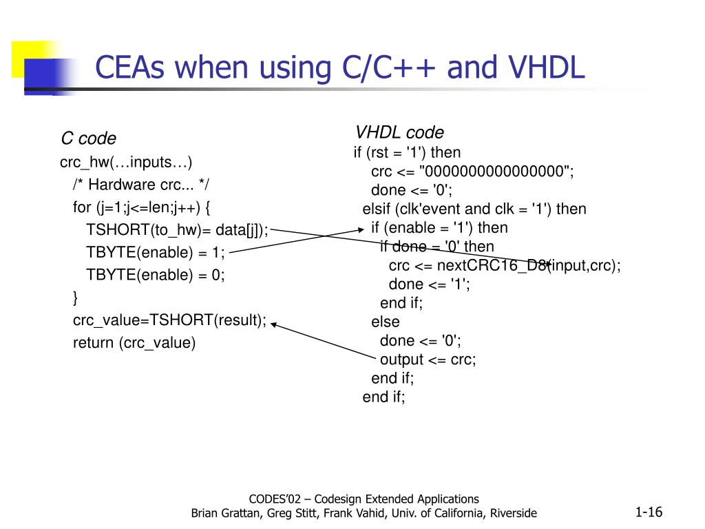 CEAs when using C/C++ and VHDL VHDL code if (rst = '1') then crc <= "0000000000000000"; done <= '0'; elsif (clk'event and clk = '1') then if (enable = '1') then if done = '0' then crc <= nextCRC16_D8(input,crc); done <= '1'; end if; else done <= '0'; output <= crc; end if; end if; C code crc_hw(…inputs…) /* Hardware crc... */ for (j=1;j<=len;j++) { TSHORT(to_hw)= data[j]); TBYTE(enable) = 1; TBYTE(enable) = 0; } crc_value=TSHORT(result); return (crc_value) CODES’02 – Codesign Extended Applications Brian Grattan, Greg Stitt, Frank Vahid, Univ. of California, Riverside