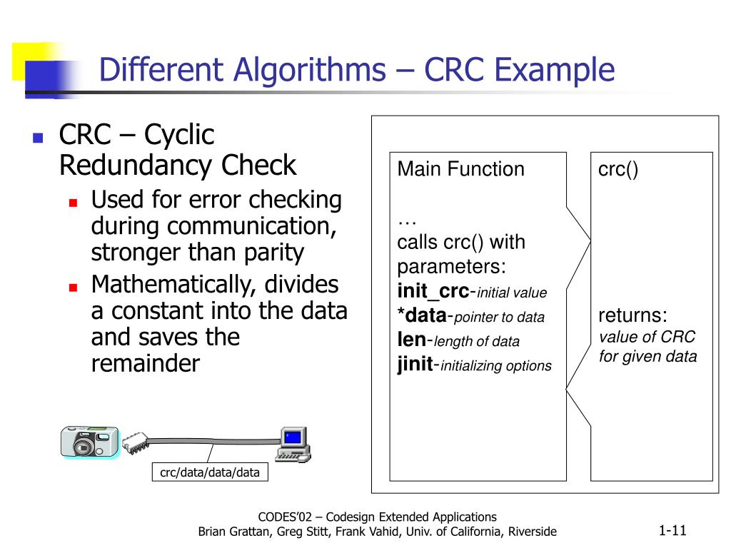 Different Algorithms – CRC Example • CRC – Cyclic Redundancy Check • Used for error checking during communication, stronger than parity • Mathematically, divides a constant into the data and saves the remainder Main Function … calls crc() with parameters: init_crc-initial value *data-pointer to data len-length of data jinit-initializing options crc() returns: value of CRC for given data crc/data/data/data CODES’02 – Codesign Extended Applications Brian Grattan, Greg Stitt, Frank Vahid, Univ. of California, Riverside