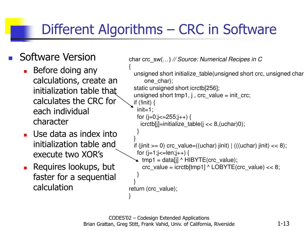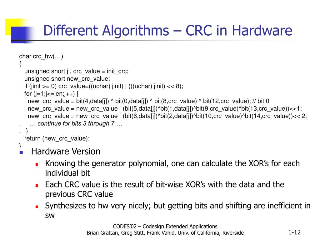 Software Version Before doing any calculations, create an initialization table that calculates the CRC for each individual character Use data as index into initialization table and execute two XOR’s Requires lookups, but faster for a sequential calculation Different Algorithms – CRC in Software char crc_sw(…) // Source: Numerical Recipes in C { unsigned short initialize_table(unsigned short crc, unsigned char one_char); static unsigned short icrctb[256]; unsigned short tmp1, j , crc_value = init_crc; if (!init) { init=1; for (j=0;j<=255;j++) { icrctb[j]=initialize_table(j << 8,(uchar)0); } } if (jinit >= 0) crc_value=((uchar) jinit) | (((uchar) jinit) << 8); for (j=1;j<=len;j++) { tmp1 = data[j] ^ HIBYTE(crc_value); crc_value = icrctb[tmp1] ^ LOBYTE(crc_value) << 8; } } return (crc_value); } CODES’02 – Codesign Extended Applications Brian Grattan, Greg Stitt, Frank Vahid, Univ. of California, Riverside