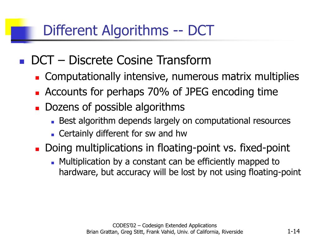 Different Algorithms -- DCT • DCT – Discrete Cosine Transform • Computationally intensive, numerous matrix multiplies • Accounts for perhaps 70% of JPEG encoding time • Dozens of possible algorithms • Best algorithm depends largely on computational resources • Certainly different for sw and hw • Doing multiplications in floating-point vs. fixed-point • Multiplication by a constant can be efficiently mapped to hardware, but accuracy will be lost by not using floating-point CODES’02 – Codesign Extended Applications Brian Grattan, Greg Stitt, Frank Vahid, Univ. of California, Riverside