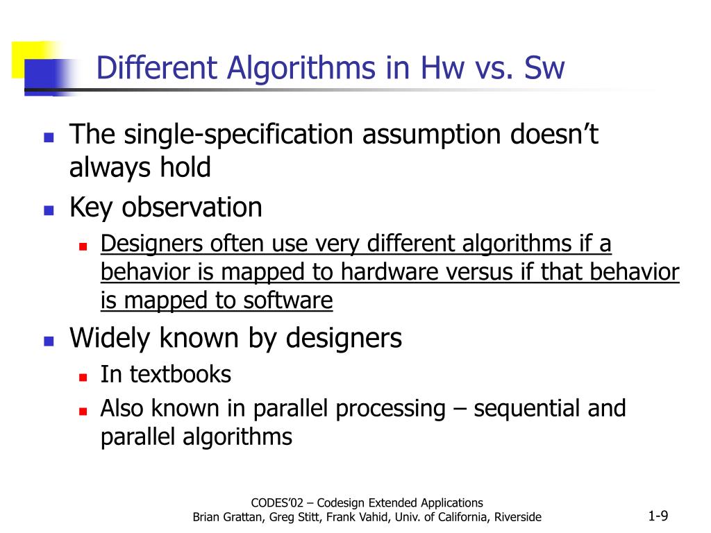 Different Algorithms in Hw vs. Sw • The single-specification assumption doesn’t always hold • Key observation • Designers often use very different algorithms if a behavior is mapped to hardware versus if that behavior is mapped to software • Widely known by designers • In textbooks • Also known in parallel processing – sequential and parallel algorithms CODES’02 – Codesign Extended Applications Brian Grattan, Greg Stitt, Frank Vahid, Univ. of California, Riverside